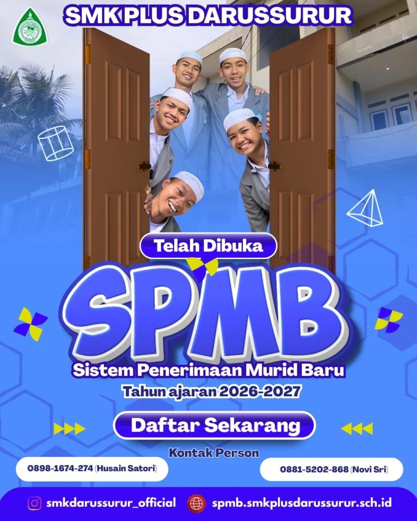SPMB SMK Plus Darussurur Cimahi Tahun Ajaran 2026–2027 SMK Plus Darussurur Cimahi secara resmi membuka Sistem Penerimaan Murid Baru (SPMB) Tahun Ajaran 2026–2027. Penerimaan ini ditujukan bagi lulusan SMP/MTs yang ingin mengembangkan kompetensi akademik, keterampilan vokasi, serta karakter Islami dalam lingkungan pendidikan yang kondusif dan berdaya saing. Kompetensi Keahlian 1. Desain dan Produksi Busana 2. …